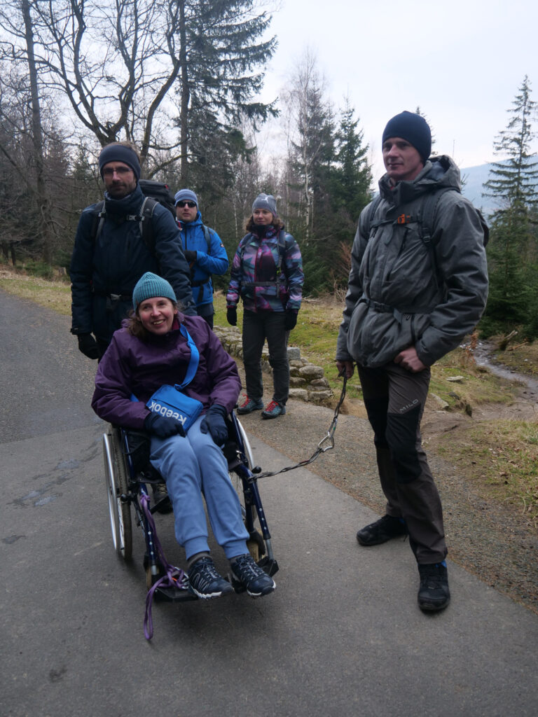 Witam wszystkich, którzy byli razem ze mną na wyjeździe w Górach Izerskich w dniach 8-9.03.2024 r., podczas którego zdobyliśmy Stóg Izerski. Naszą przewodniczką była Ania Kaleta. Wróciłam po bardzo długiej przerwie w góry i na górski szlak, który pokonałam na wózku dzięki pomocy 3 silnych mężczyzn i dziewcząt. W pierwszy dzień wyjazdu dotarłam na wierzchołek Stogu Izerskiego do schroniska. Z Powrotem musiałam zjechać kolejką. Niemniej jednak i tak osiągnęłam szczyt w jedną stronie. Niestety trasa w dół była zbyt ostra dla wózka i dla wolontariuszy. Pytałam jeszcze na dole, zanim wyruszyliśmy na szlak górski czy dam radę w dwie strony przetoczyć się na wózku, ale okazało się, że bezpiecznie będzie tylko do góry, gdyż droga powrotna jest bardzo stroma. W związku z tym zjechałam kolejką od schroniska. Szkoda, ale dobre i to.