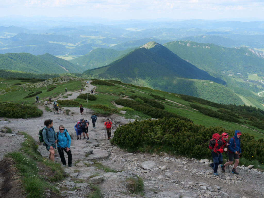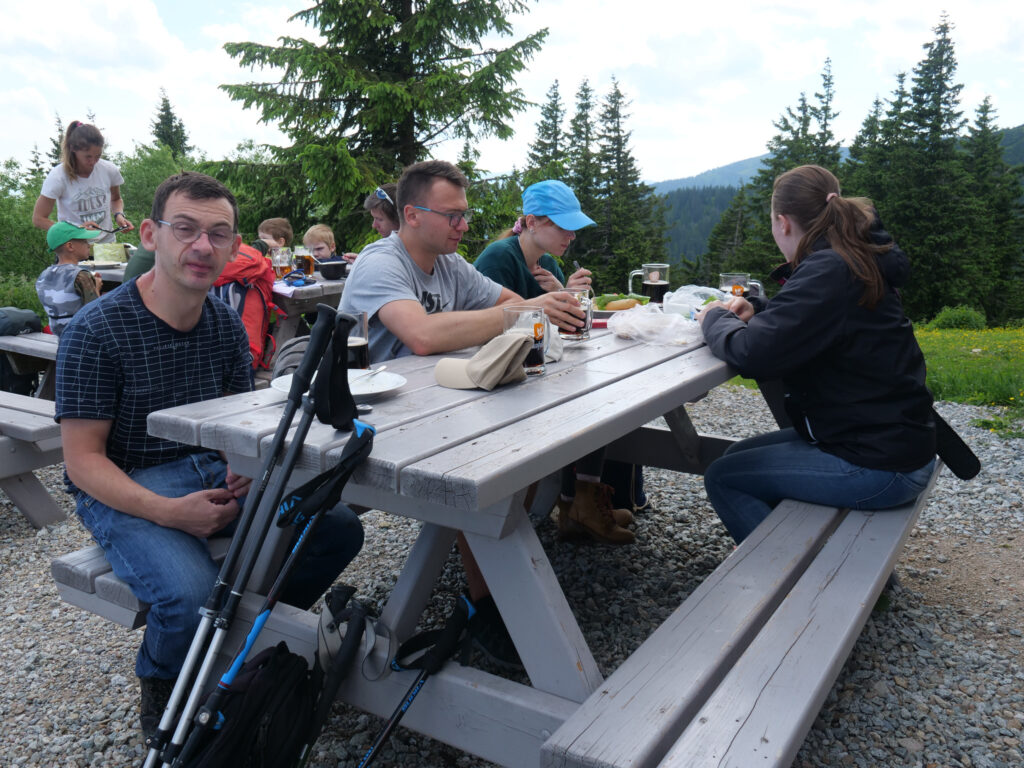 Zgodnie z przewidywaniami różnych wykresów pogodowych już od samego momentu startu powinniśmy poruszać się w strugach deszczu. Tymczasem dobrze widoczny szczyt Babiej Góry wydawał się wstrzymywać wodę w kłębiących się nad nią chmurach. W dobrych nastrojach zdobywaliśmy kolejne metry ścieżki. Tym razem nie wybrał się z nami nikt poruszający się na wózku, ale warto podkreślić, że spora część szlaku tzw. Hviezdoslavova Aleja dobrze nadaje się dla turystów na kółkach. Dość długo kontynuowaliśmy naszą wspinaczkę w górę suchą stopą. W końcu pojawił się jednak spodziewany deszcz, najpierw zaznaczając swoją obecność drobnymi kroplami by stopniowo zwiększać swoją moc. Szczyt Babiej Góry schował się w gęstych chmurach, a nogi zaczęły ślizgać się na mokrych kamieniach. Nie mieliśmy wątpliwości, że odwrót to najbardziej słuszna decyzja. Przemoczeni, w świetnych nastrojach dotarliśmy do Chaty Slaná Voda koło godziny 17:00. Z wielką chęcią rozsiedliśmy się przy stołach, by zamówić coś ciepłego do jedzenia z repertuaru słowackiej kuchni.